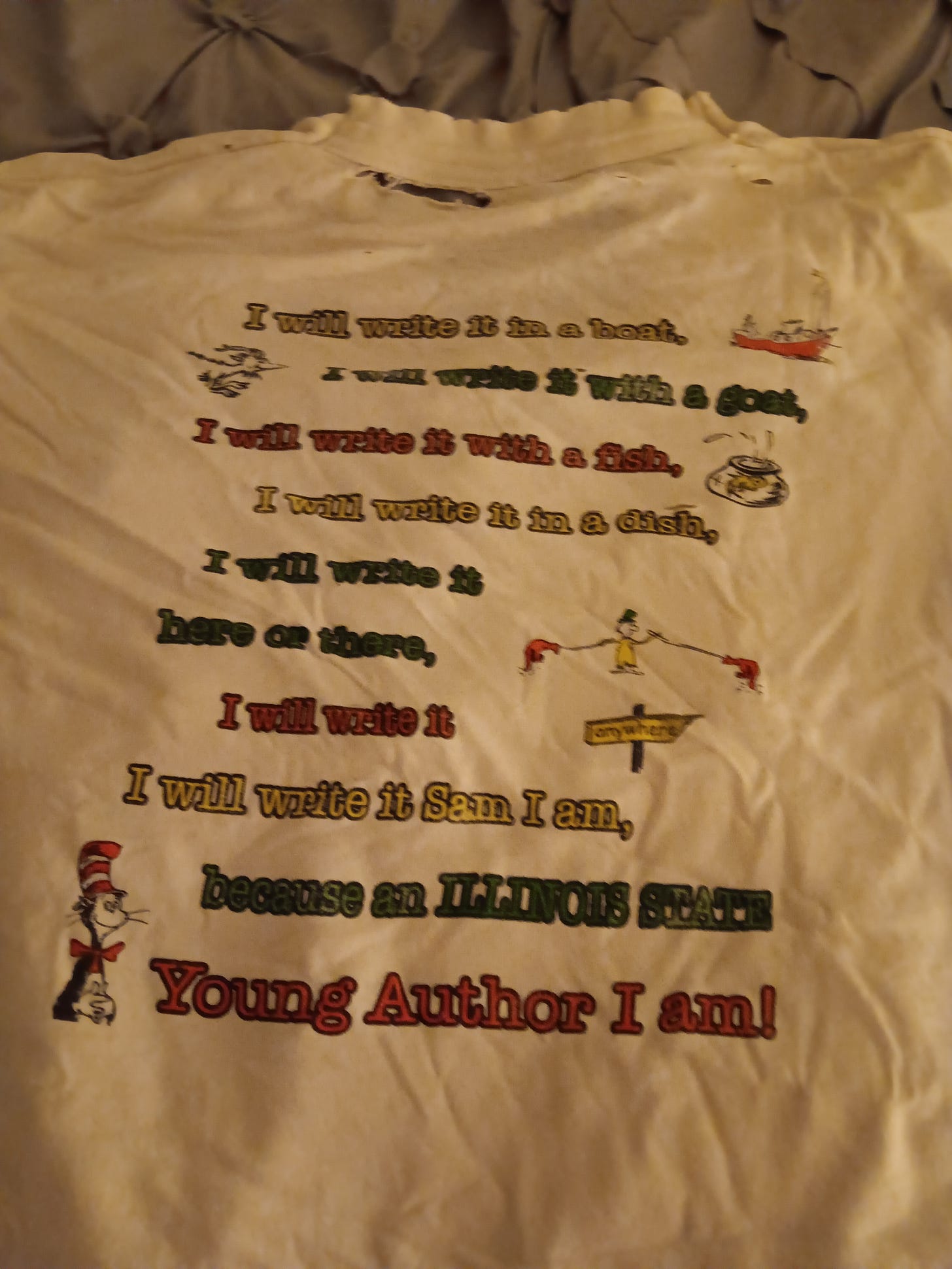 5th grade comes and I penned this two pages of notebook paper front and back short story about the Y2K computer bug was a literal, sentient creature and how my brother and I had to travel to New York to kill it(I was in 5th grade fall 1999- spring 2000 so this hella timely and topical) and my story somehow ended up being chosen to represent my school at this Young Writer's contest down in the state capital. Very cool indeed. They printed up my story and hardcover bound it as to make it look legit and gave everyone at the event reception t shirts with a Dr. Seuss inspired poem on it and in my memory, I recall standing up on stage holding my book aloft and feeling so fucking special.